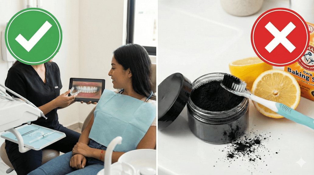 Don’t even think about using baking soda or lemon! Those home remedies will only ruin your teeth forever. Better take a look at our dental health blog to see what actually works.